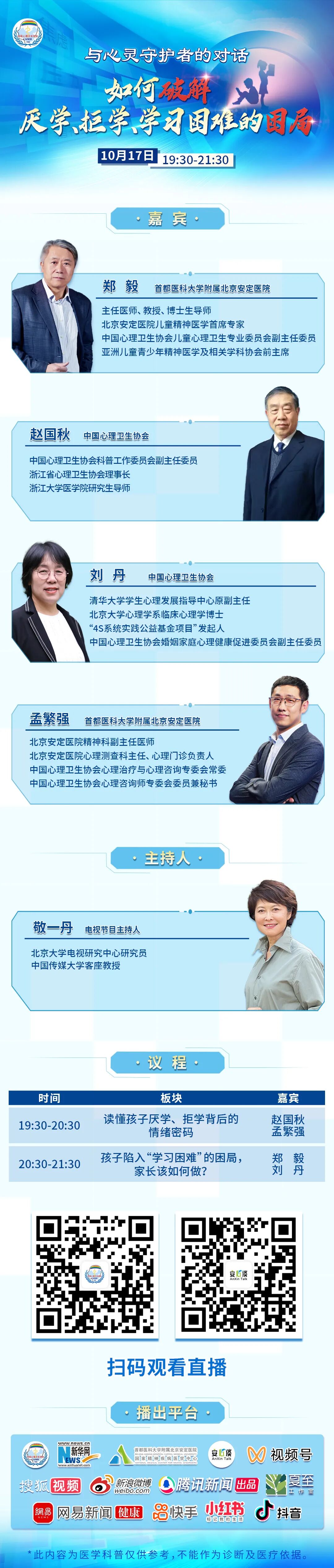 著名主持人敬一丹与北京安定医院儿童精神医学首席专家郑毅、中国心理卫生协会科普工作委员会副主任委员赵国秋、中国心理卫生协会婚姻家庭心理健康促进委员会副主任委员刘丹、北京安定医院精神科副主任医师孟繁强与您共同解密此话题。