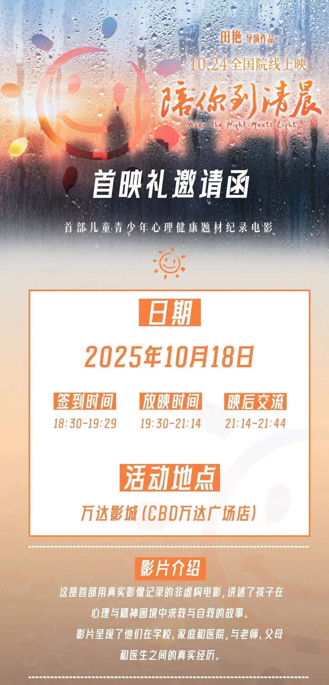 “心影相随”是中国心理卫生协会倾力打造的品牌化心理成长公益项目,旨在通过影像媒介普及心理健康知识,积极探索艺术与心理融合的干预新路径。由中国心理卫生协会指导的首部儿童青少年心理健康题材纪录电影《陪你到清晨》将于10月18日晚举办首映礼活动。